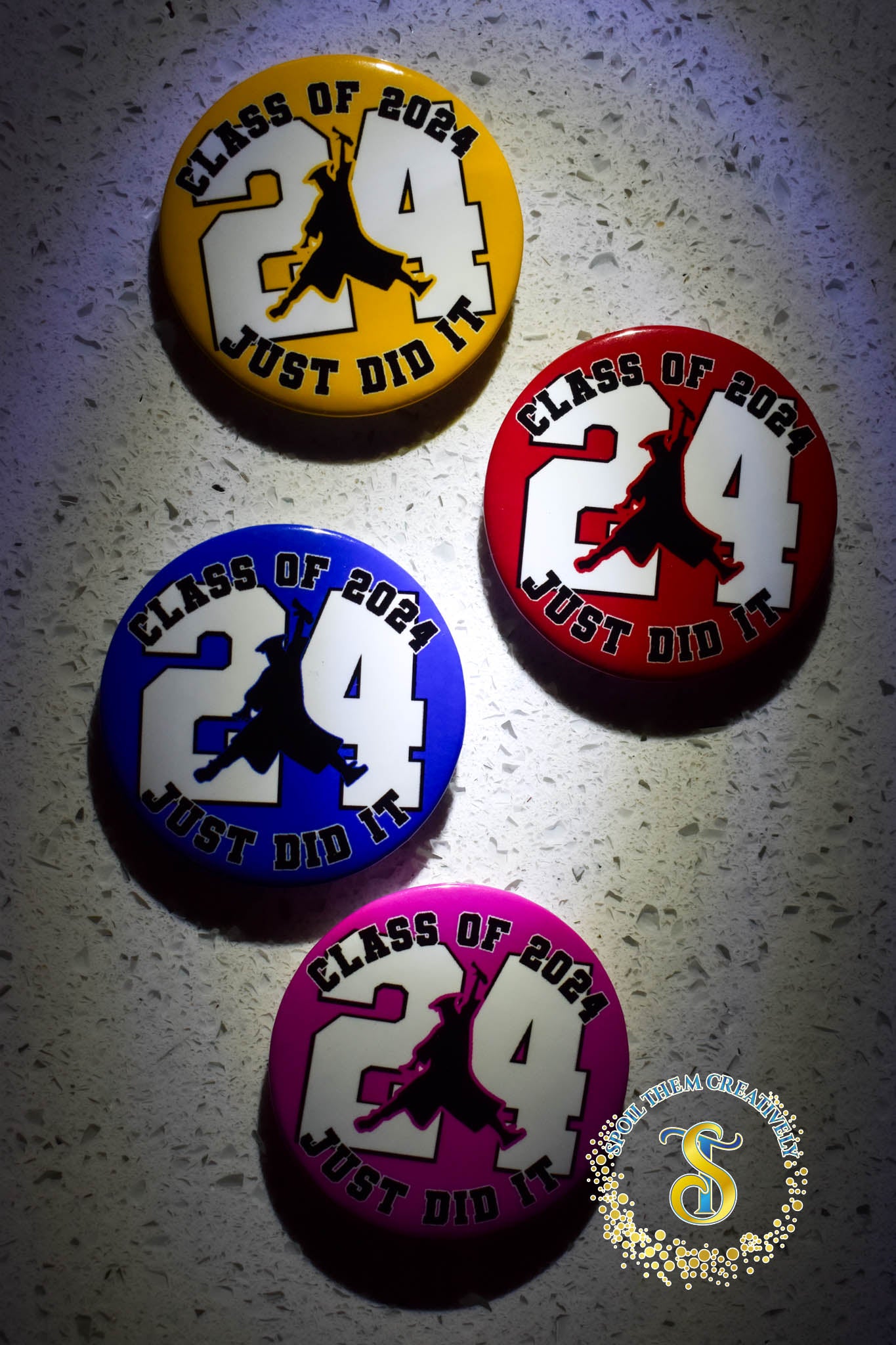 Elevate your style and embrace the future with our exclusive Class of 2024 Pin Buttons. These Just Did It Buttons are made from metal, yet are lightweight and durable with a strong safety pin. Each button is a statement piece, a tiny but yet mighty herald of the coming year. Pin them to your outfits, bags, or anywhere you want to showcase your pride.