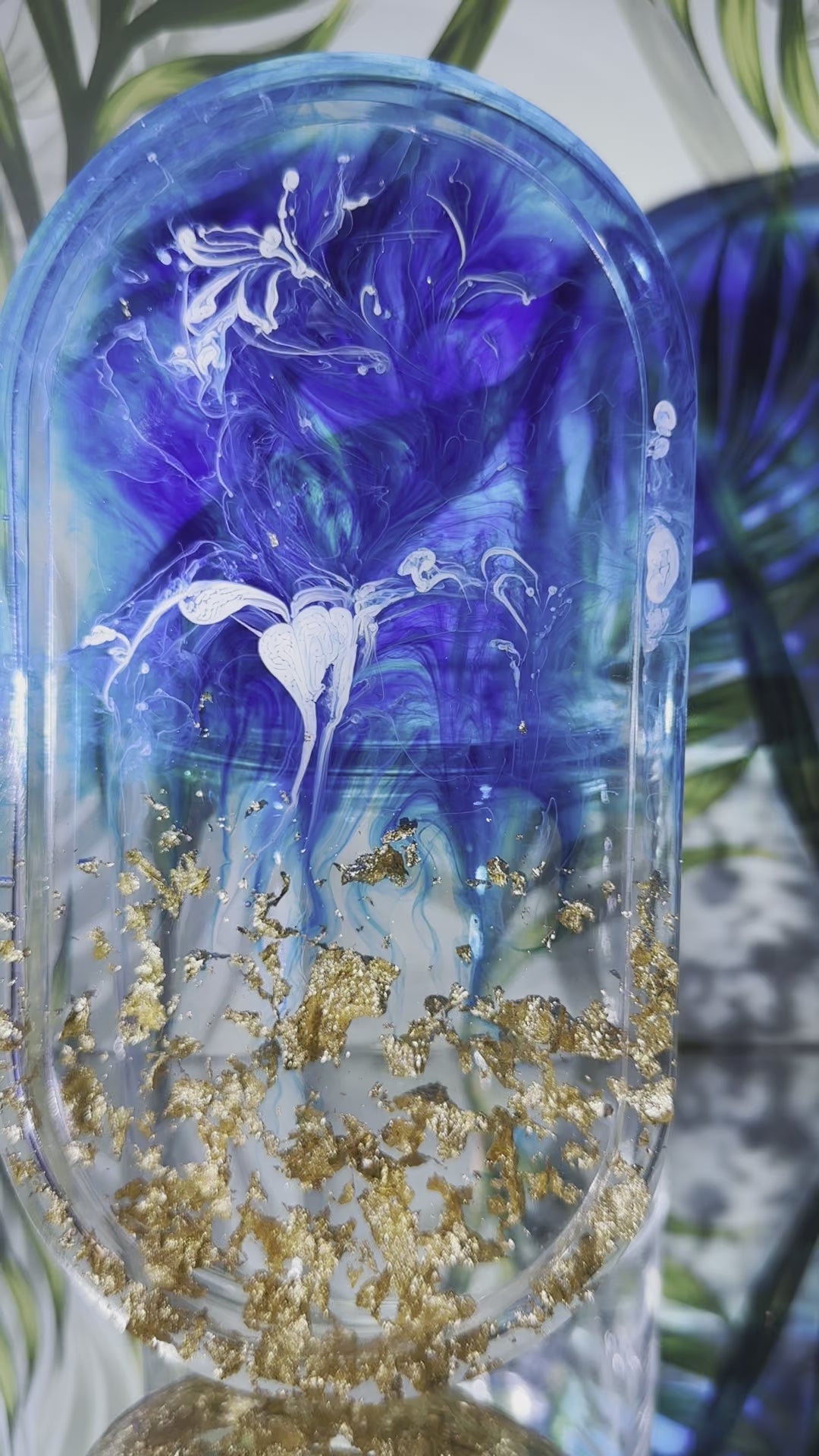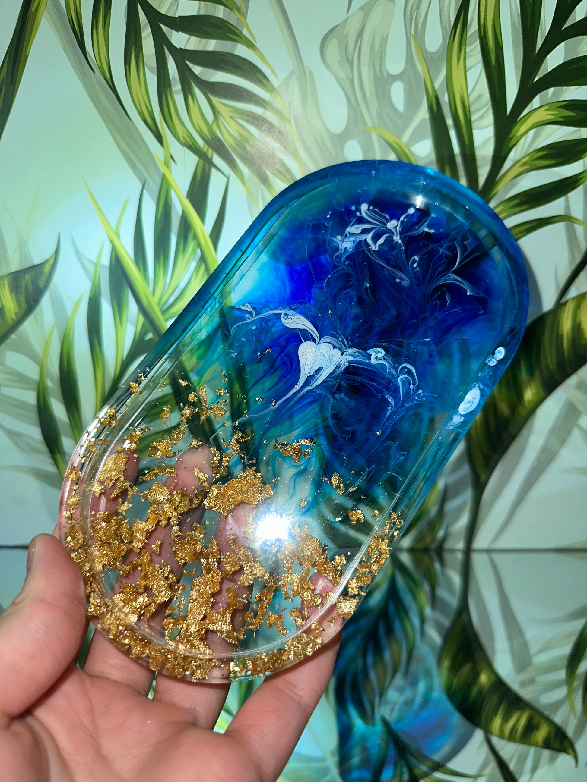 One of a Kind, Blue Resin Trinket Tray. Blue, white and gold in color. Luxury on a budget. Perfect tray to give as a gift to someone special. Add any customization for $5 more.