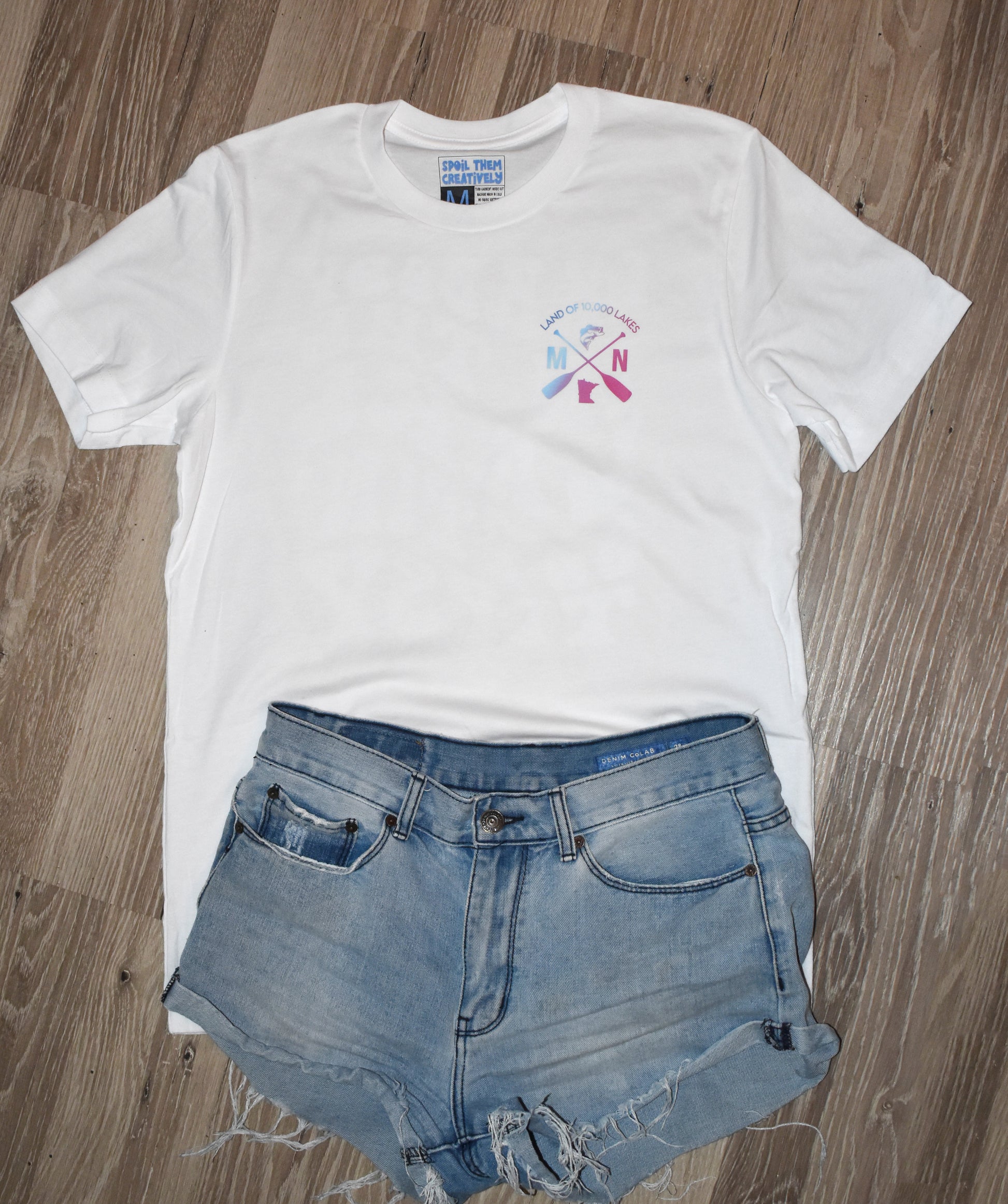 Errbody in the lake getting tipsy t-shirt. This white t-shirt features a blue and pink ombre design on both the front and the back. The front of the shirt reads "Land of 10,000 Lakes, MN" and the back of the shirt reads "Errbody in the Lake Gettin' Tipsy". Free shipping included in price.