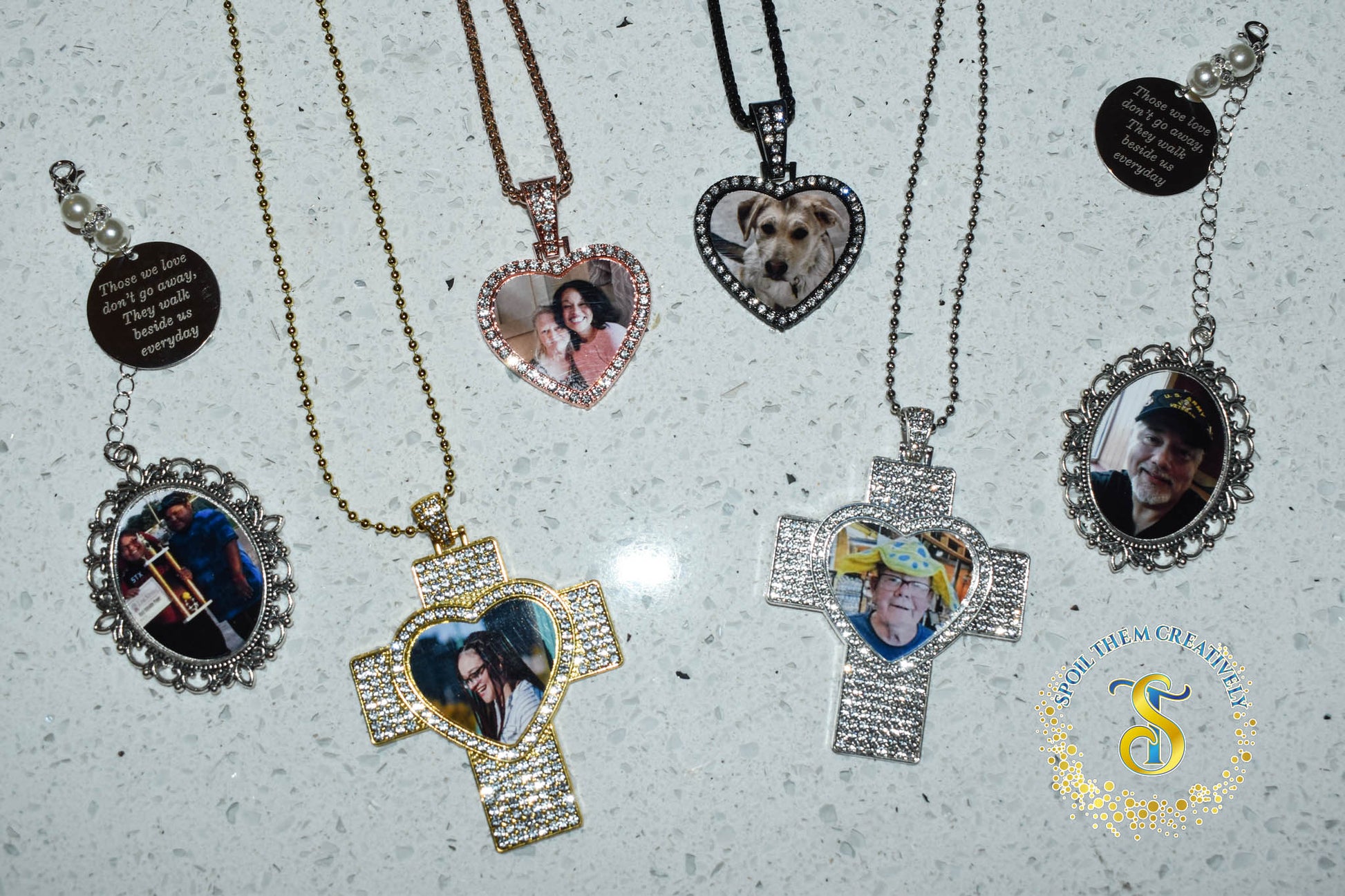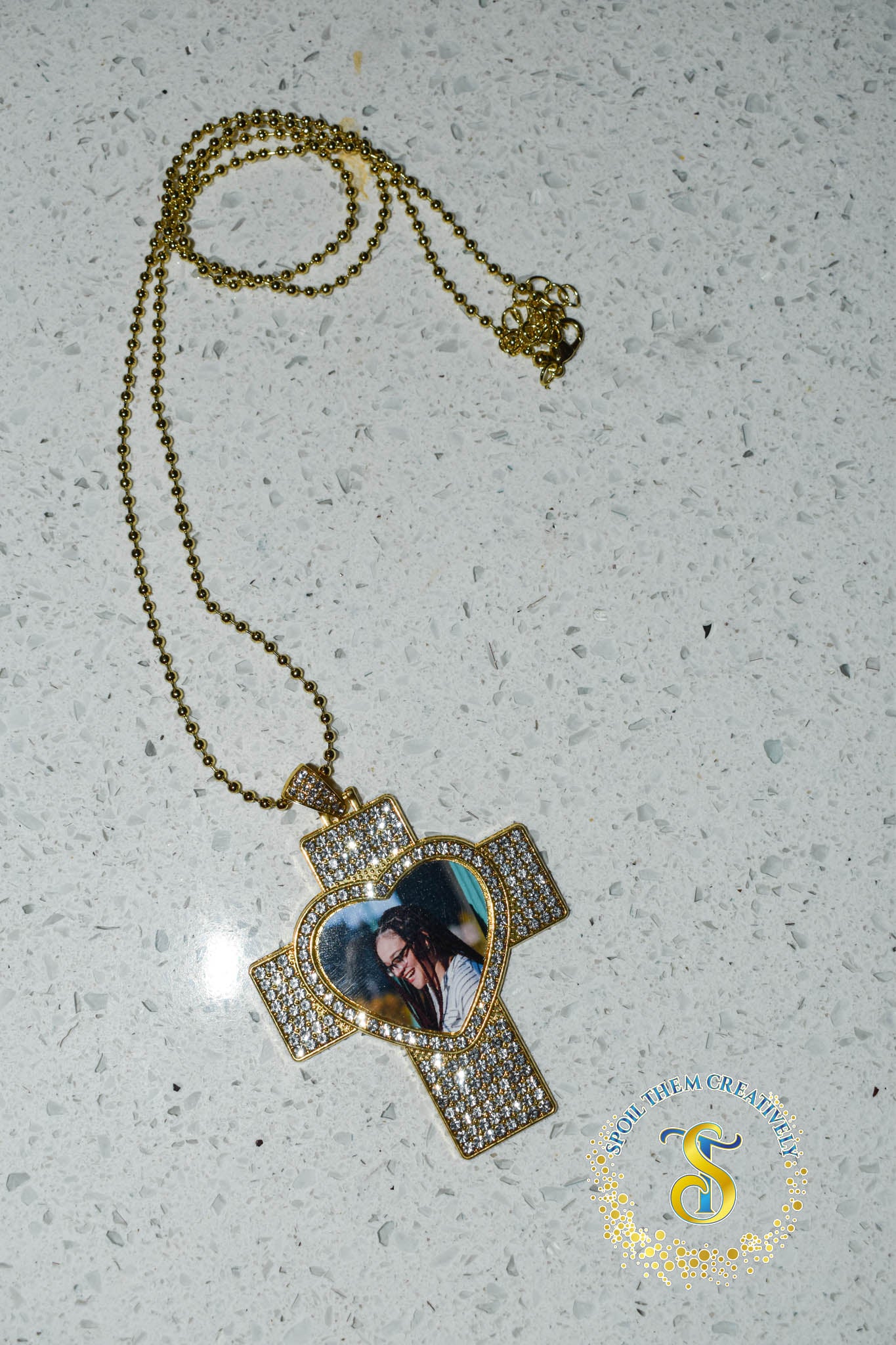 A perfect way to keep your loved one with you in an elegant way. These gold and silver rhinestone cross necklaces shine bright and makes for a perfect memorial keepsake. Pictures don’t do them justice! The Cross Necklace with a Heart-Shaped Photo is one sided and can feature only one picture. Each necklace comes with a lobster clasp at the top, the chain and the rhinestone cross pendant with your picture featured.