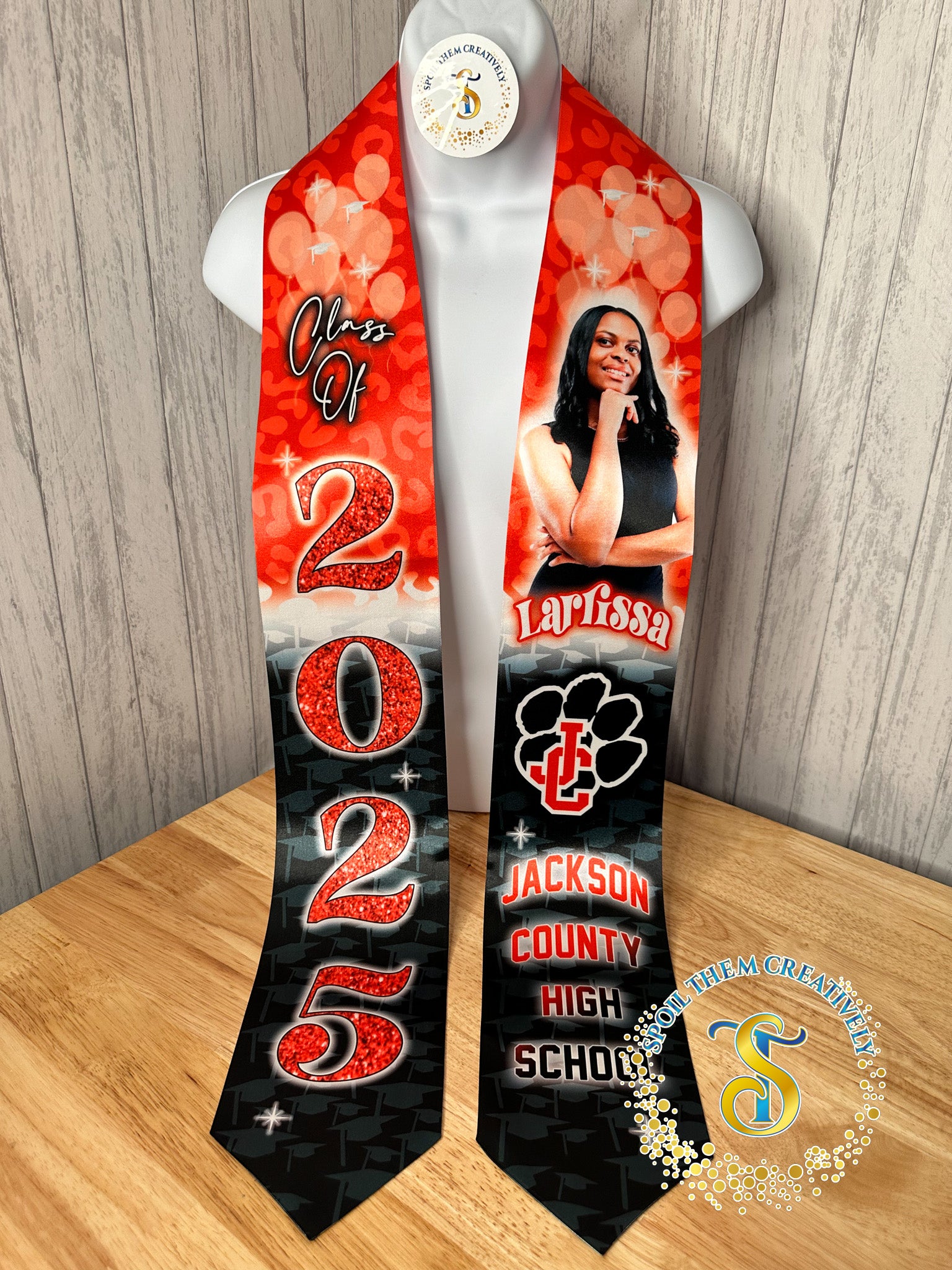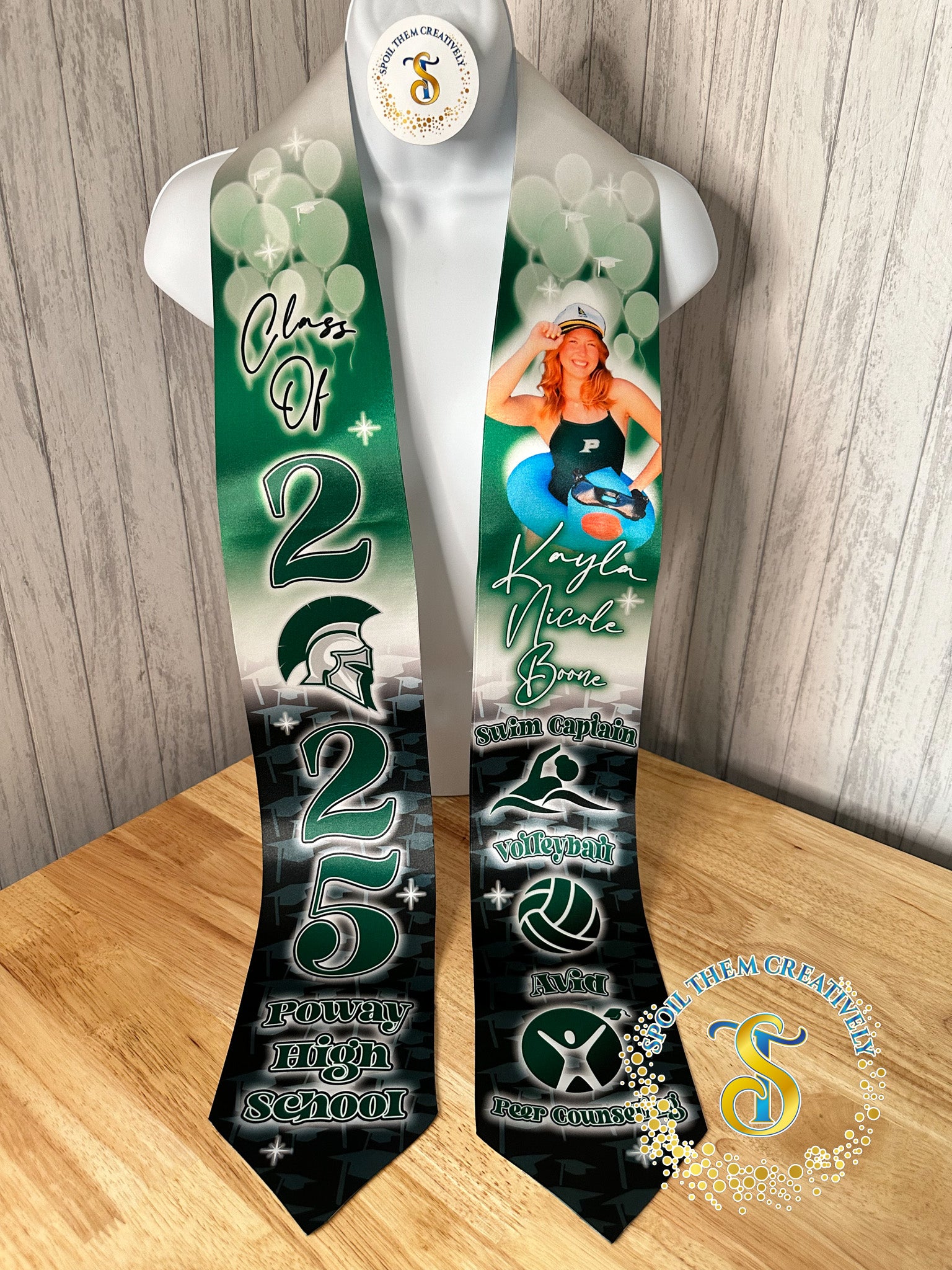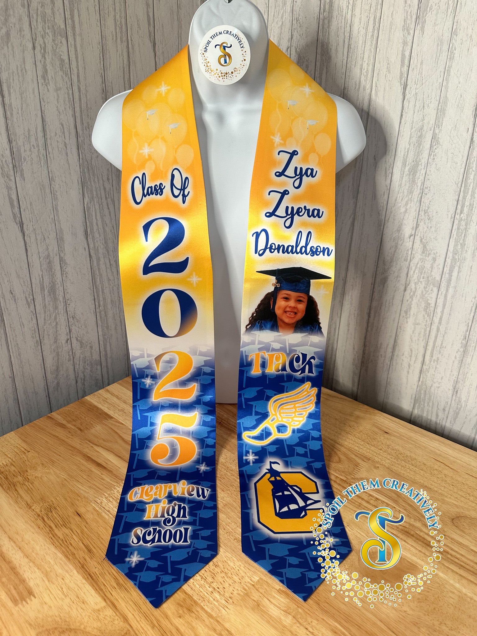Custom graduation stoles are made from a nice silky satin material. Each stole is 72ā long in total length. Each side is 36ā long. These are made using an ink transfer. Gold and silver colors wanted will be created from printable CMYK colors. Embroidery, 3D options, and glitter borders (or any borders) are not available at this time.