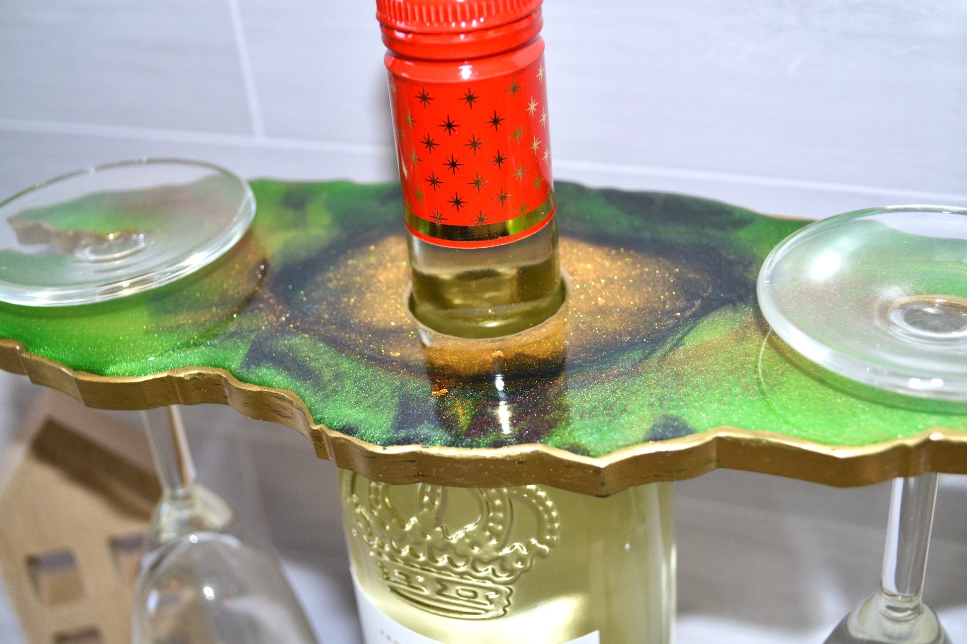 Beautifully handcrafted epoxy/resin wine butler with two matching coasters. Green, black and gold in color. Luxury on a budget. Perfect use for a wedding or gift set. Wine butler allows for a flawless look when hanging two wine glasses upside down.