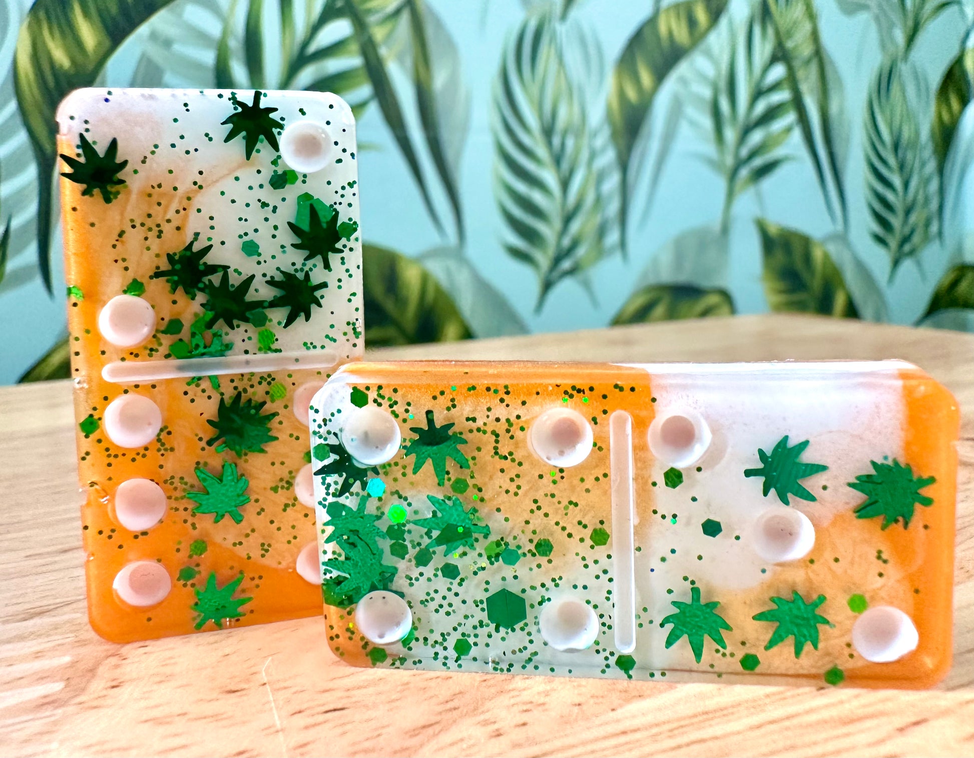 One of a Kind, Green Leaf Creamsicle Resin Domino Set. Orange, white and green in color. Do you still play dominoes? Perfect set to bring to any party. Domino set comes in a plastic case.