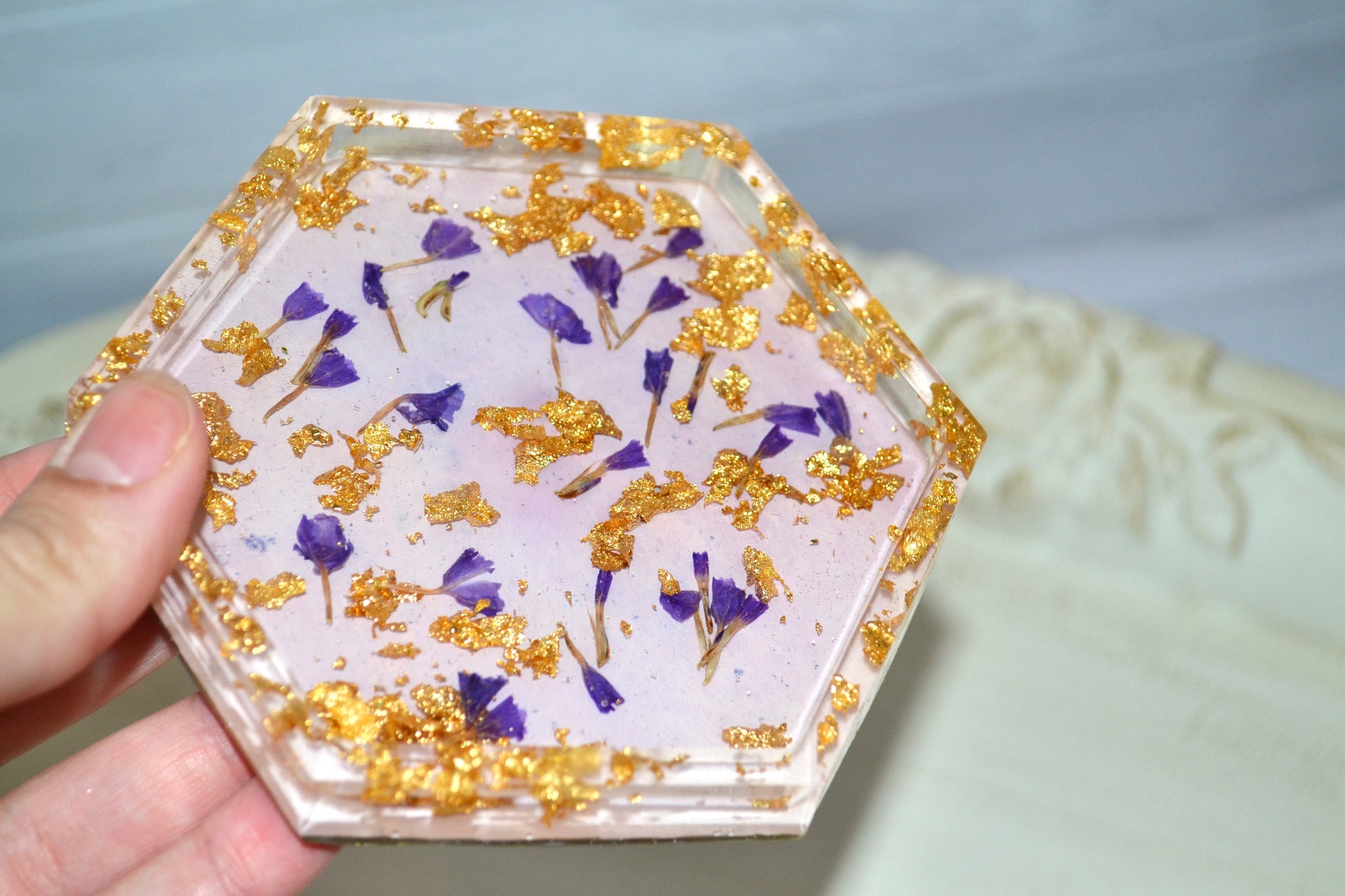 Beautifully handcrafted epoxy/resin hexagon trinket tray. Luxury on a budget. Purple, white, and gold in color. Just what your dresser or side table is missing for a flawless look.
