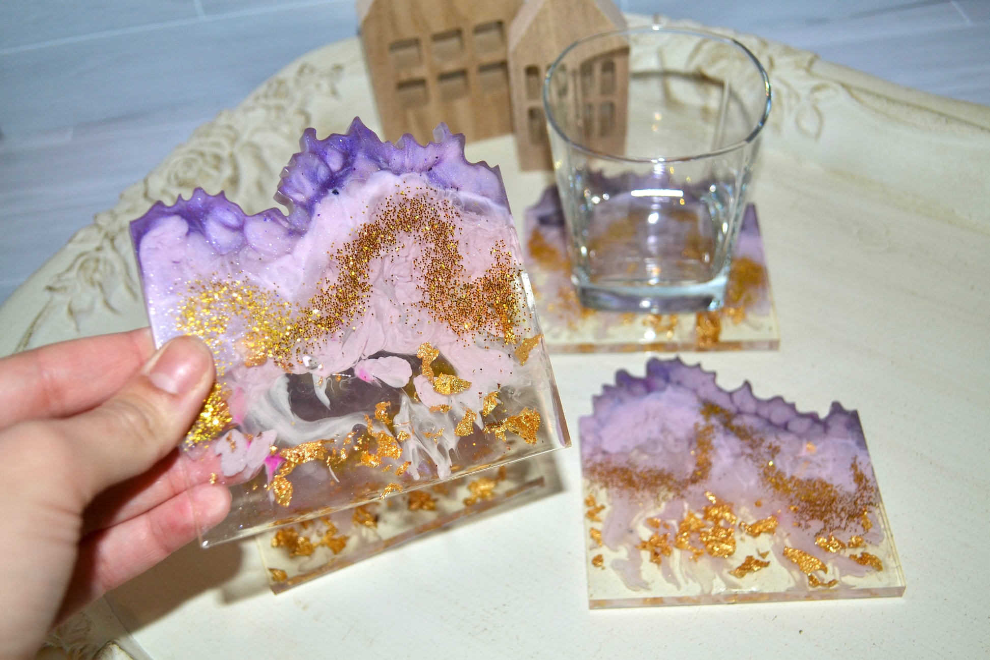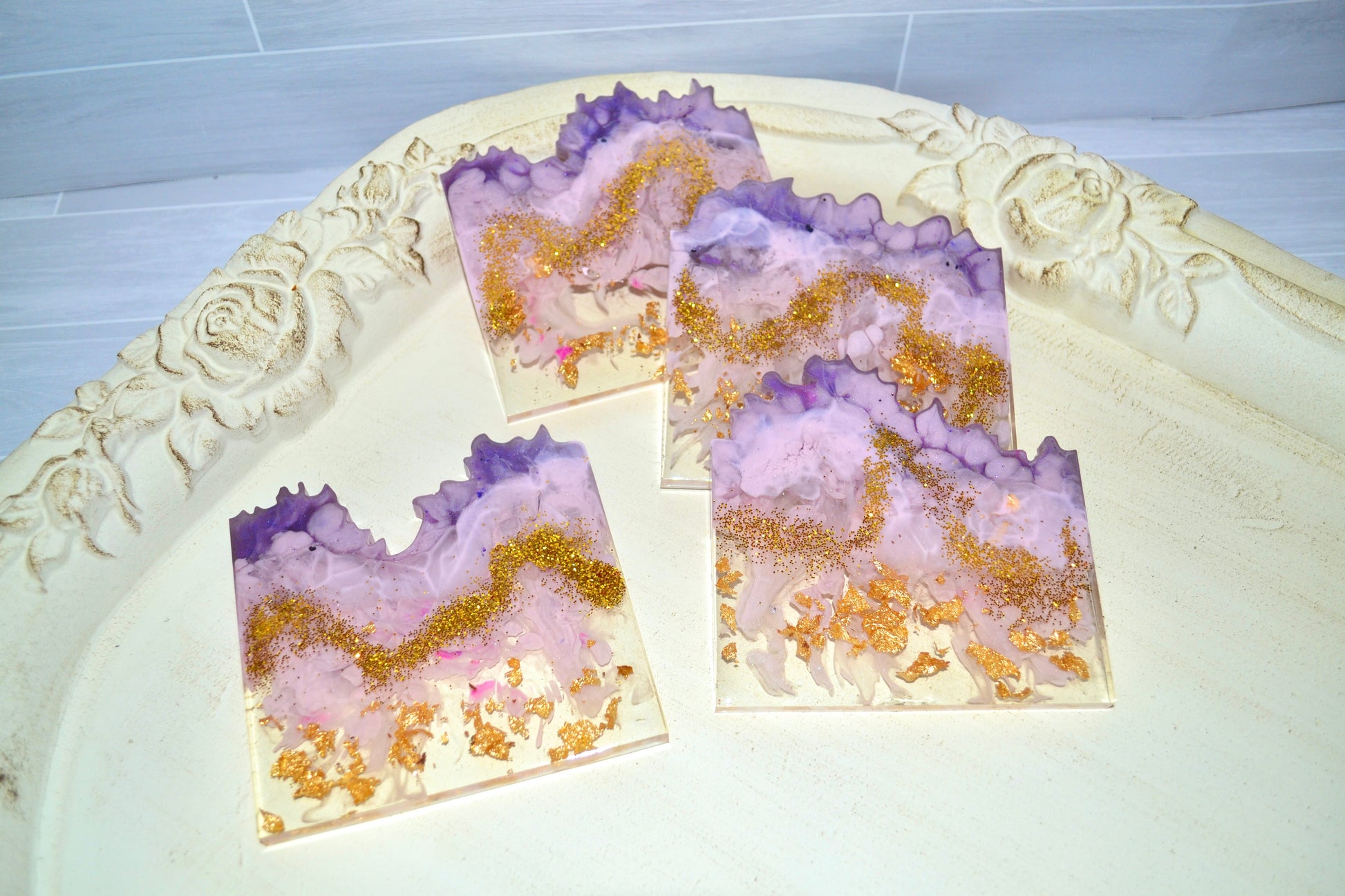 Beautifully handcrafted epoxy/resin geode like coaster set. Luxury on a budget. Set of four coasters are included. Purple, white, and gold in color. Perfect as a wedding or house warming gift.