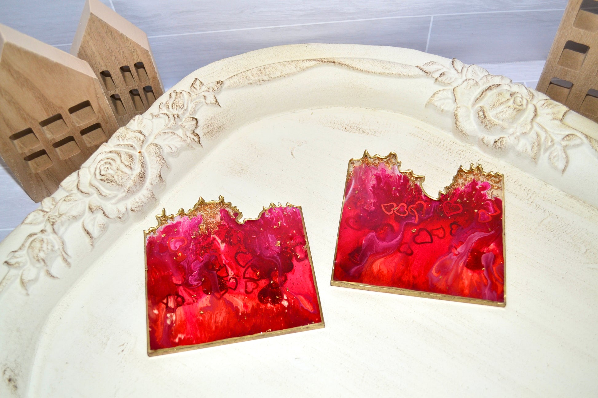 Beautifully handcrafted epoxy/resin geode like coaster set. Luxury on a budget. This set includes two coasters. Red, white, and gold in color, with hearts added. Perfect as a wedding or house warming gift.